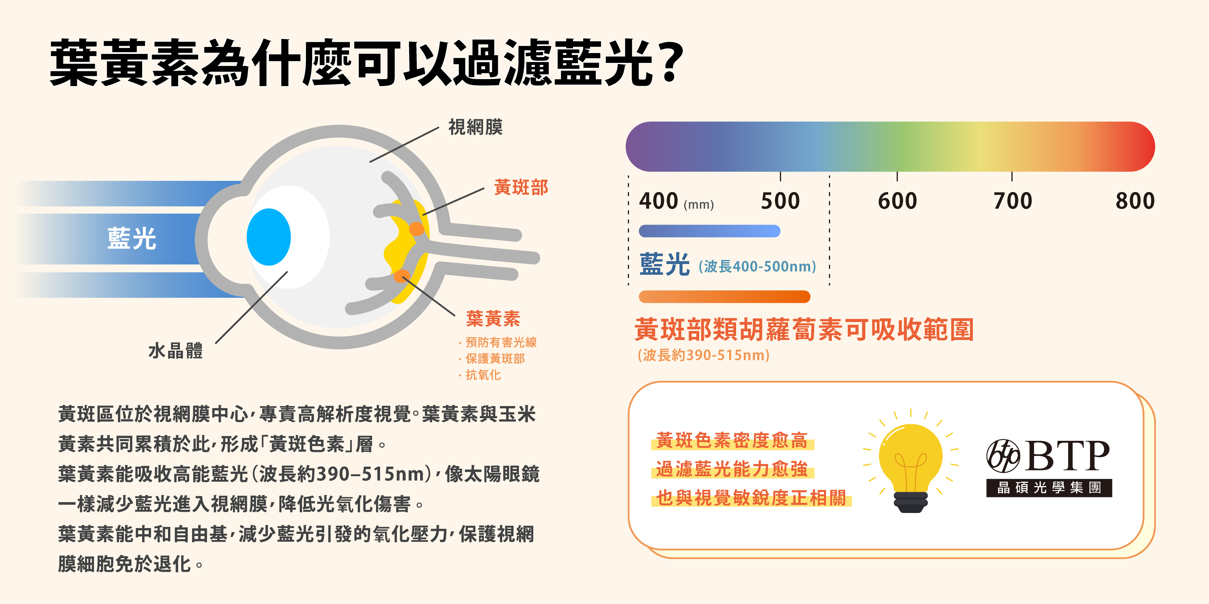 造成視網膜損傷的光線波長範圍,主要是落在 400-450 nm 之間,而黃斑部上的這些類胡蘿蔔素可吸收的範圍是 390-515 nm 左右,剛好就涵蓋了會對視網膜造成損傷的波長範圍。