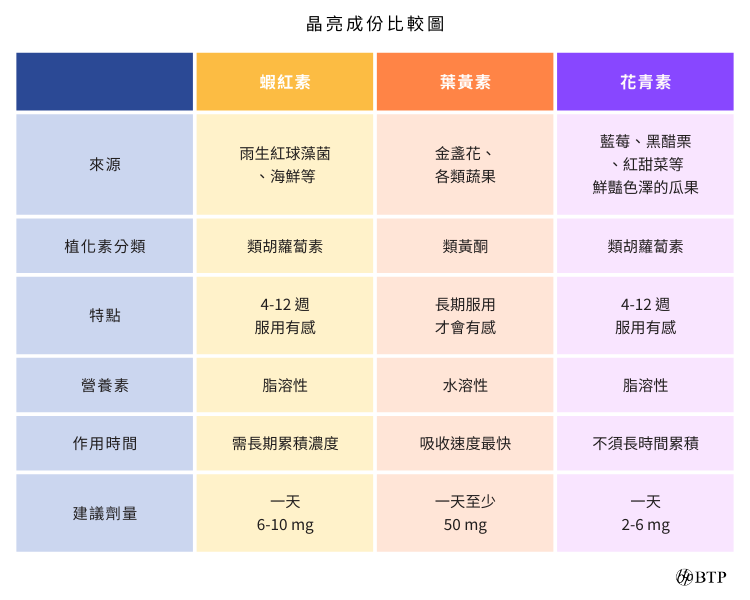 不同產品可能會標示不同來源、濃度或專利萃取,購買時要注意包裝是否有明確的劑量、濃度和來源,這樣跟葉黃素吃下來才會有相輔相成的效果。