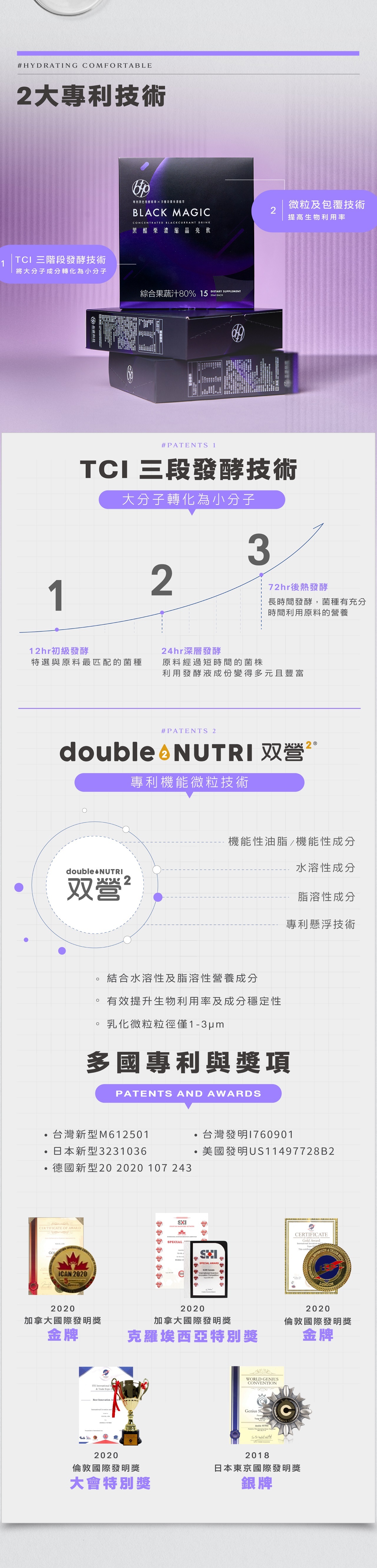 ▸ 兩大專利技術:TCI三階段發酵技術 + 双營微粒及包覆技術
