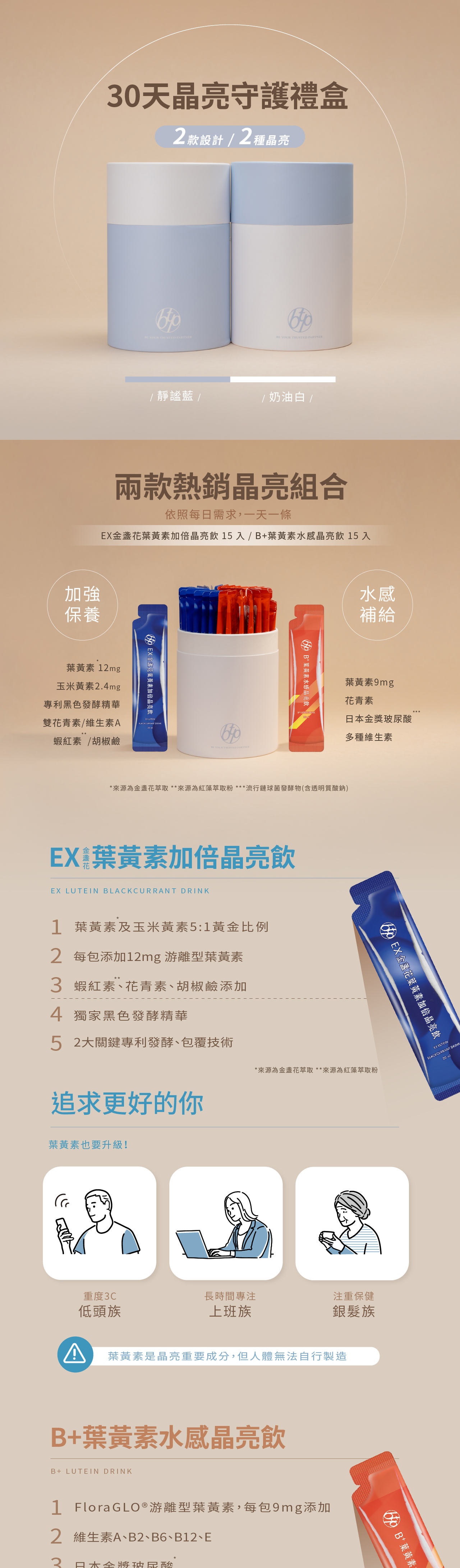 📍 內容物: B+葉黃素水感晶亮飲20ml_15入 + EX金盞花葉黃素加倍晶亮飲20ml_15入
