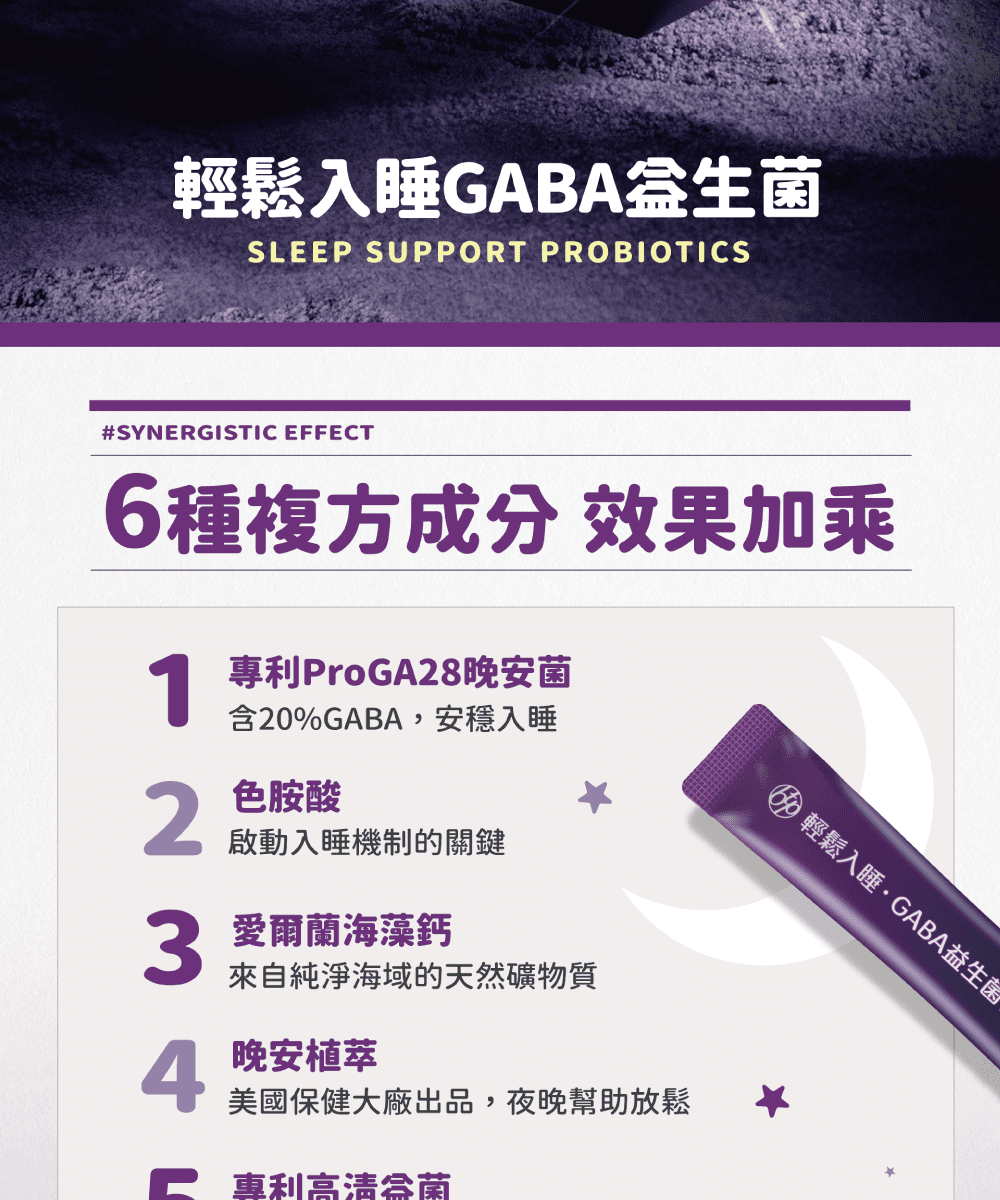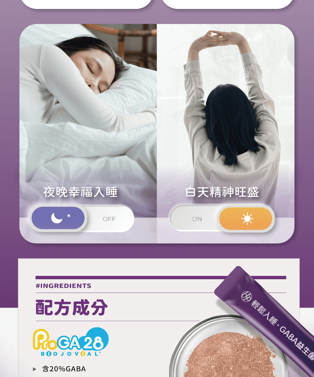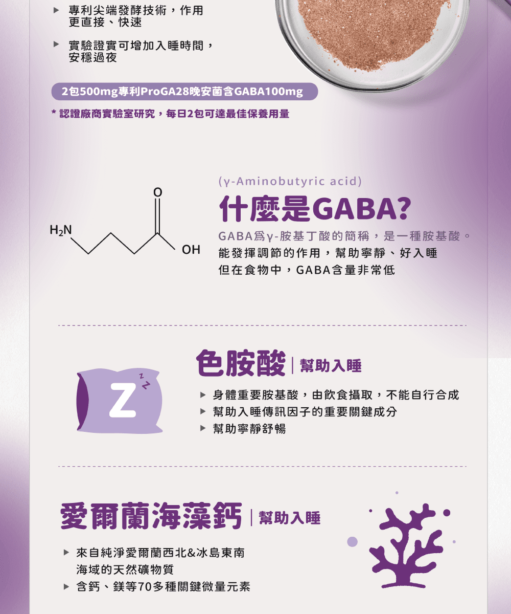 ▸ 專利ProGA28晚安菌,2包含GABA 100mg;每日2包,達最佳保養用量