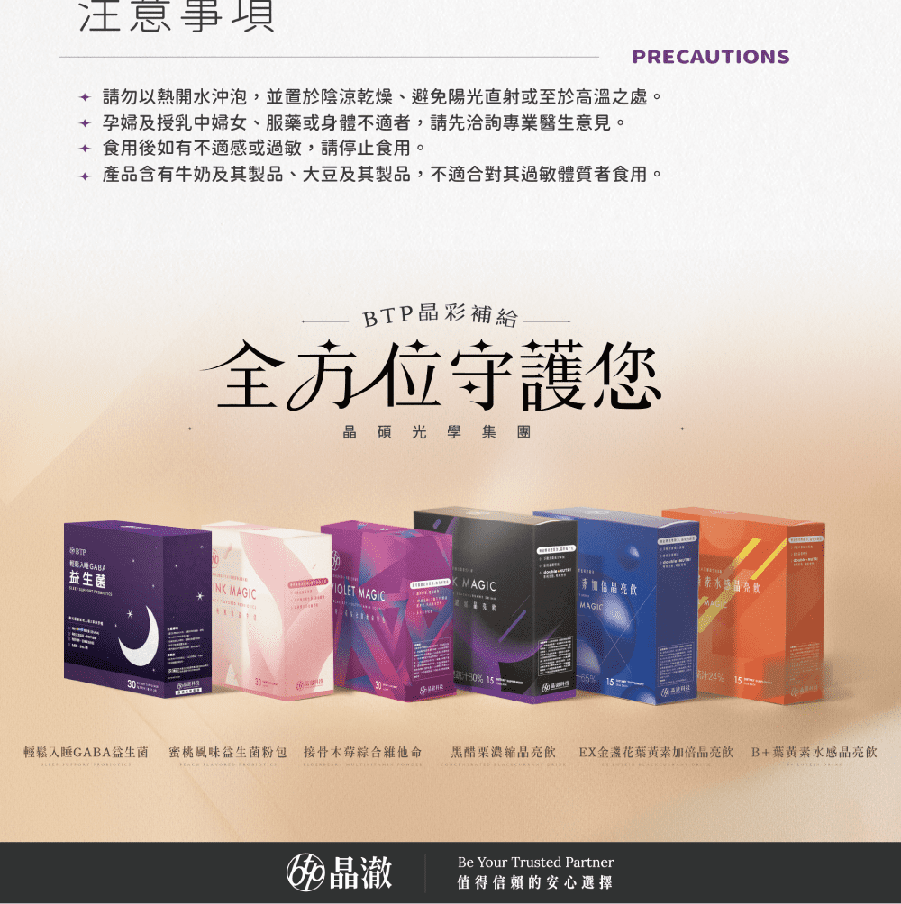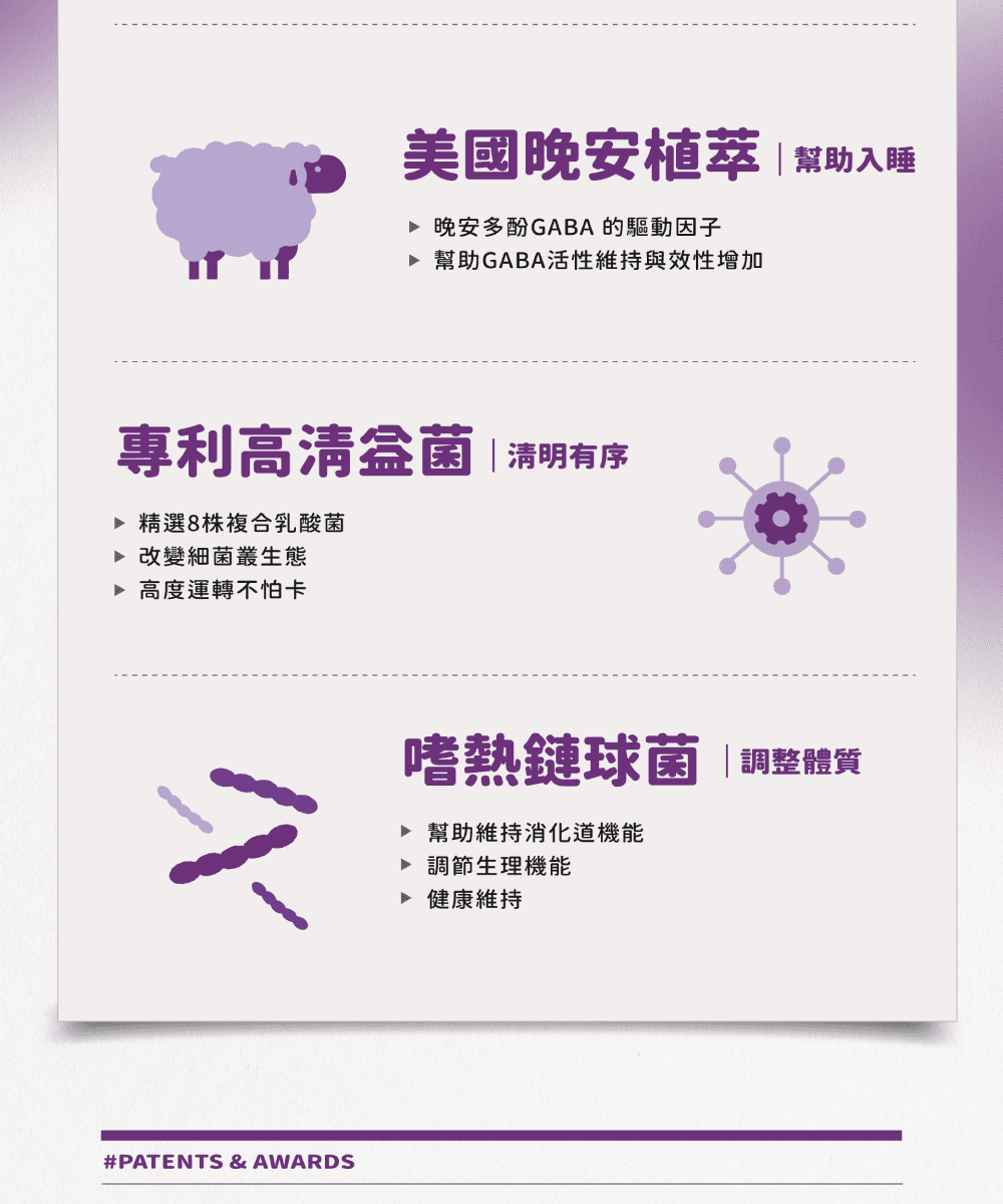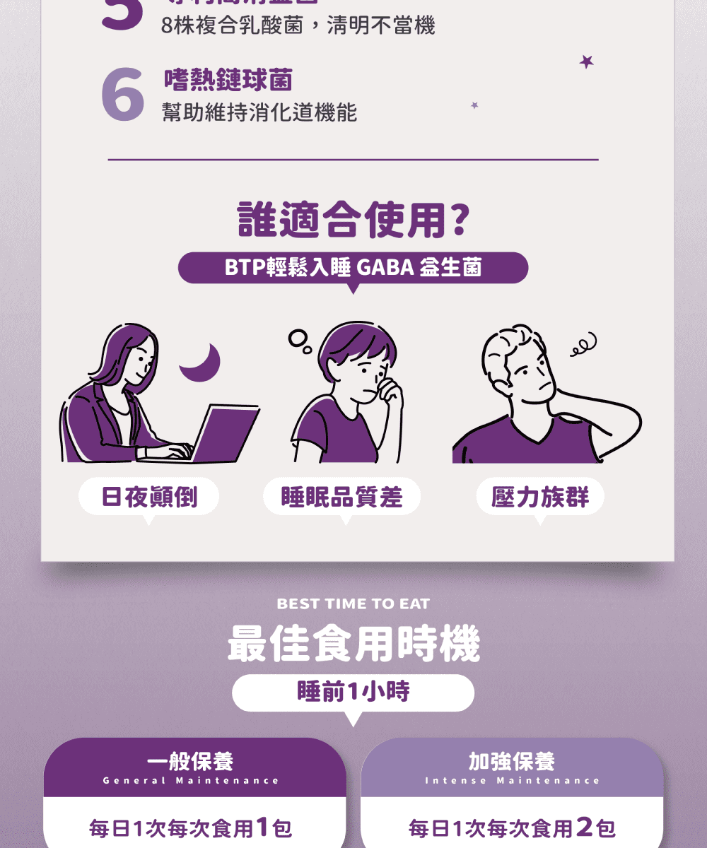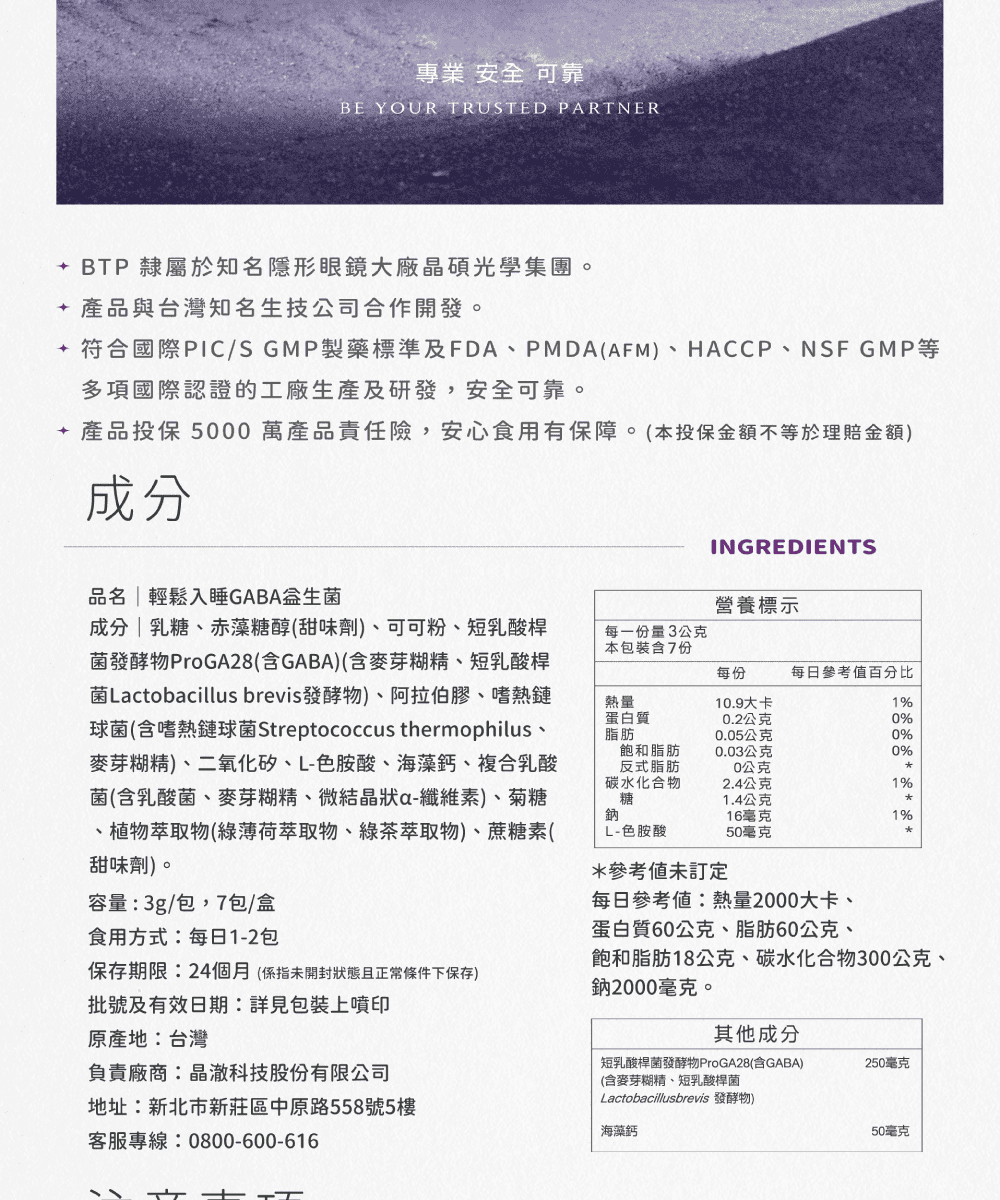 ▸ 專利ProGA28晚安菌,2包含GABA 100mg;每日2包,達最佳保養用量