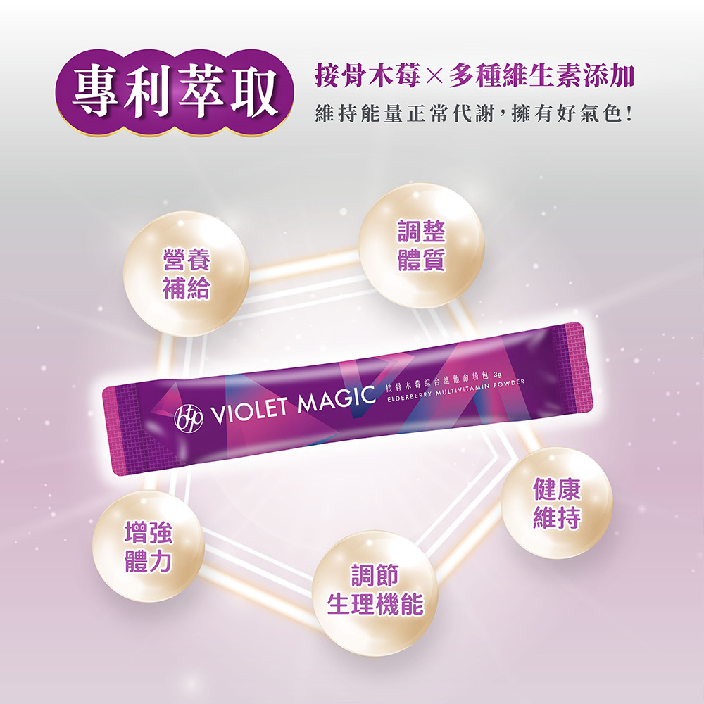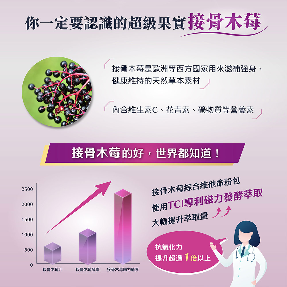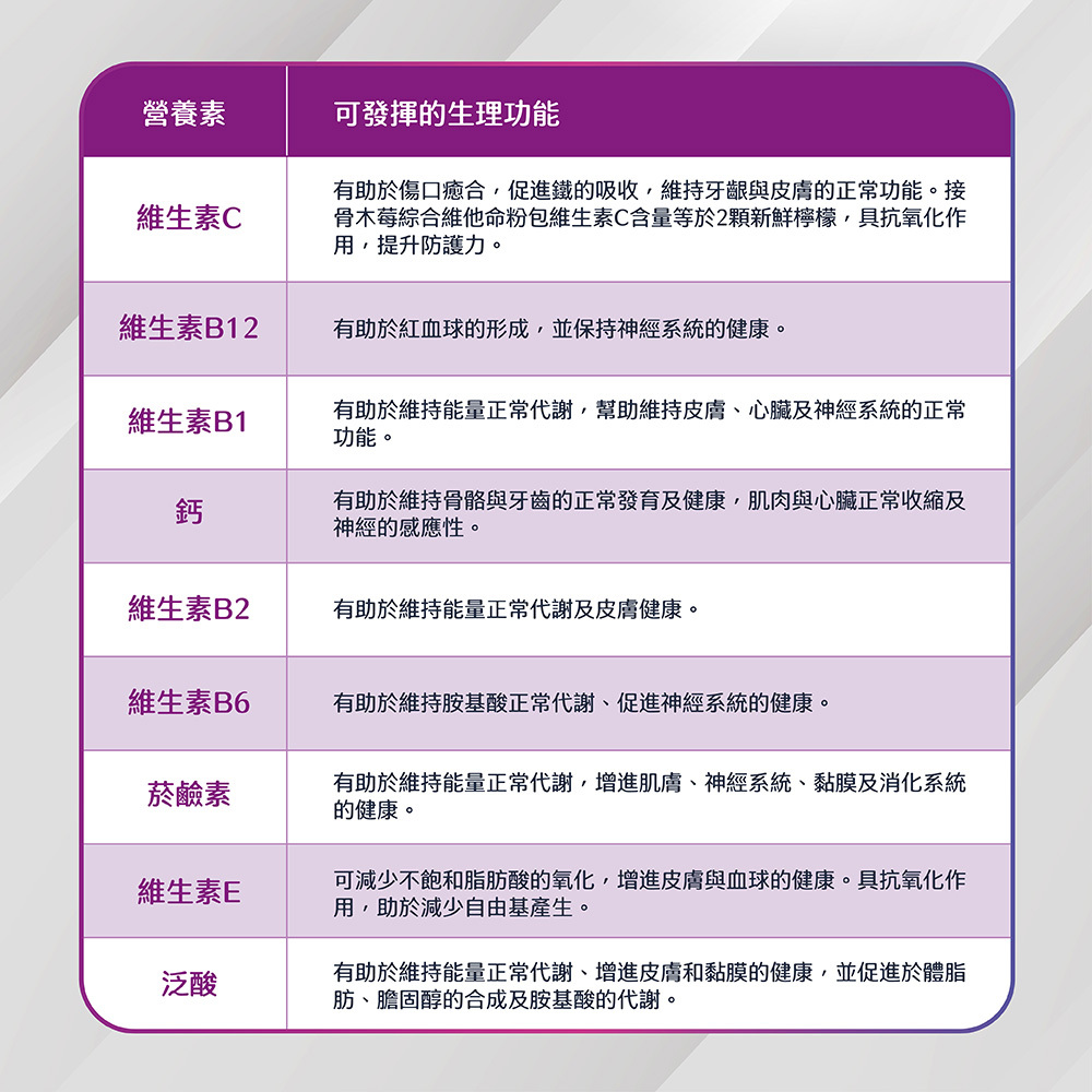 💡 獨家營養補給配方:接骨木莓、西印度櫻桃、維生素B1, B2, B3, B5, B6, B12、維生素C、維生素E